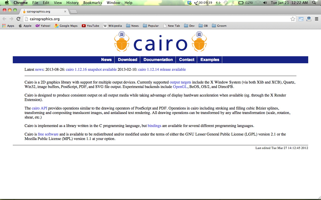 Cairo is a 2D graphics library with support for multiple output devices. Currently supported output targets include the X Window System (via both Xlib and XCB), Quartz, Win32, image buffers, PostScript, PDF, and SVG file output. Experimental backends include OpenGL, BeOS, OS/2, and DirectFB.